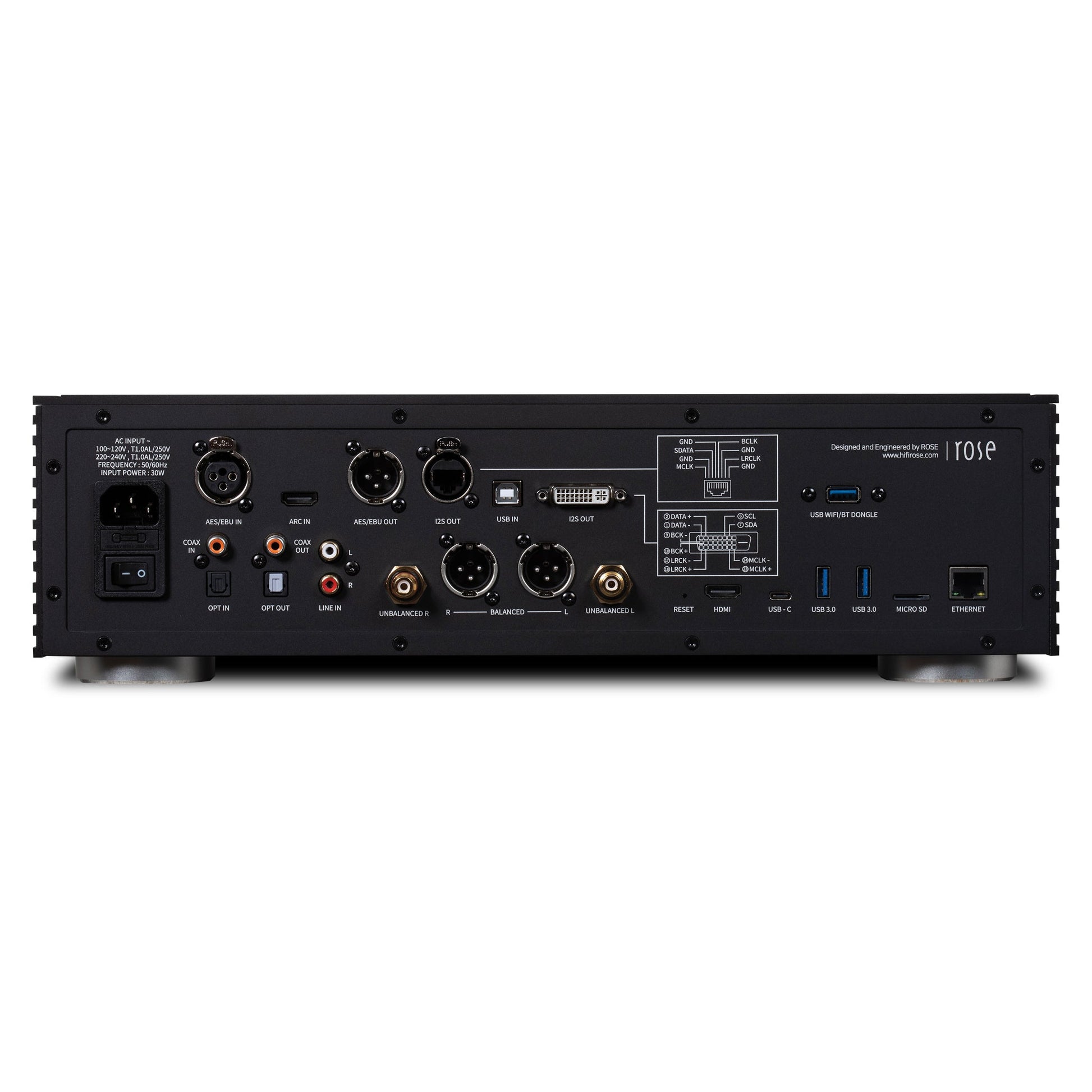 Digital: 1 x optical, 1 x coax S/PDIF, 1 x USB Audio, 1 x I2S-DVI, 1 x I2S-RJ45, 1 x AES/EBU digital XLR