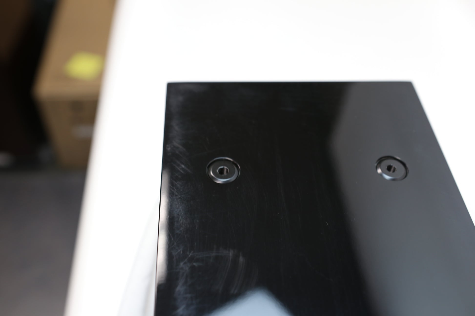 Note: Box is damaged. The bottom of the speakers are scuffed with swirls on the finish. See photos