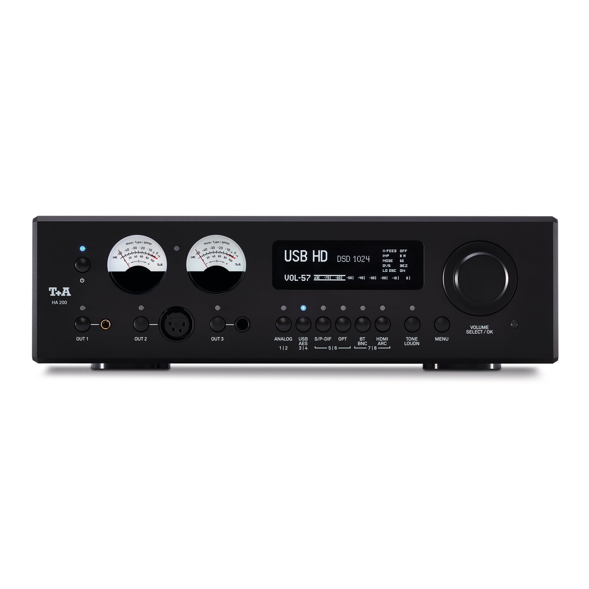 As with all T+A components, the HA 200 will probably surprise you with its weight. In addition to the large number of quality components, the chassis of the HA 200 is hewn from thick aluminum with the front panel machined from a solid plate. Accurate QPPM metering instruments and a large screen supply important system information, and provide an accurate indication of operating conditions. The FM8 IR remote control controls all functions of the HA 200.